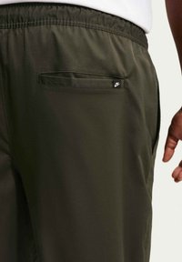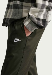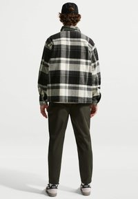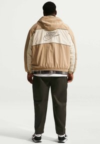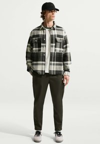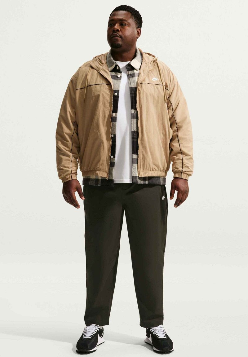 Homme portant une veste à capuche beige sur une chemise à carreaux noir et blanc, un t-shirt blanc, un pantalon noir et des baskets noir et blanc, debout immobile.