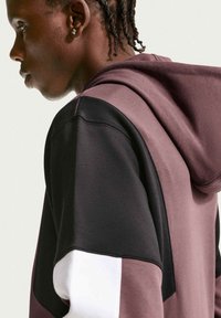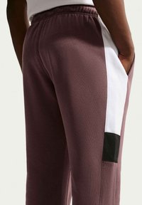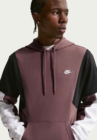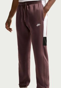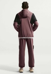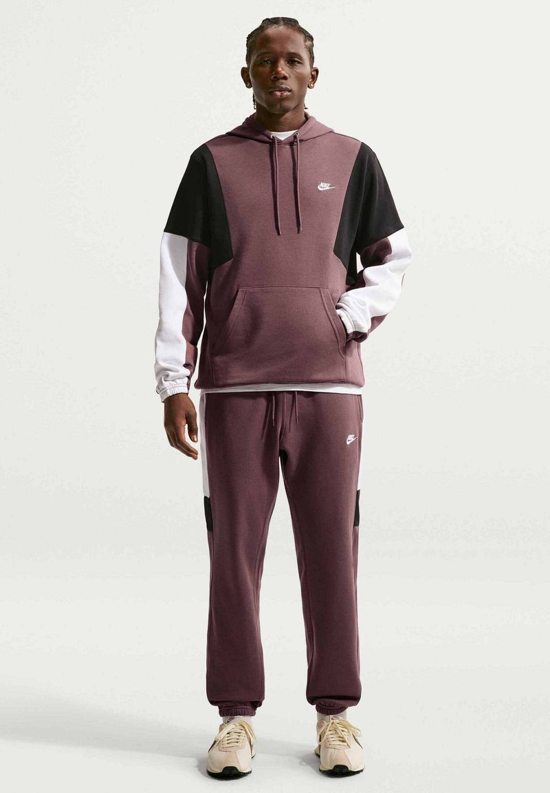 Jeune homme portant un sweat à capuche Nike bordeaux, noir et blanc avec un pantalon de jogging assorti et des baskets beige, debout devant un fond uni.