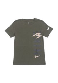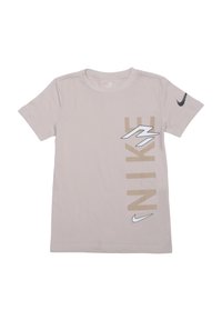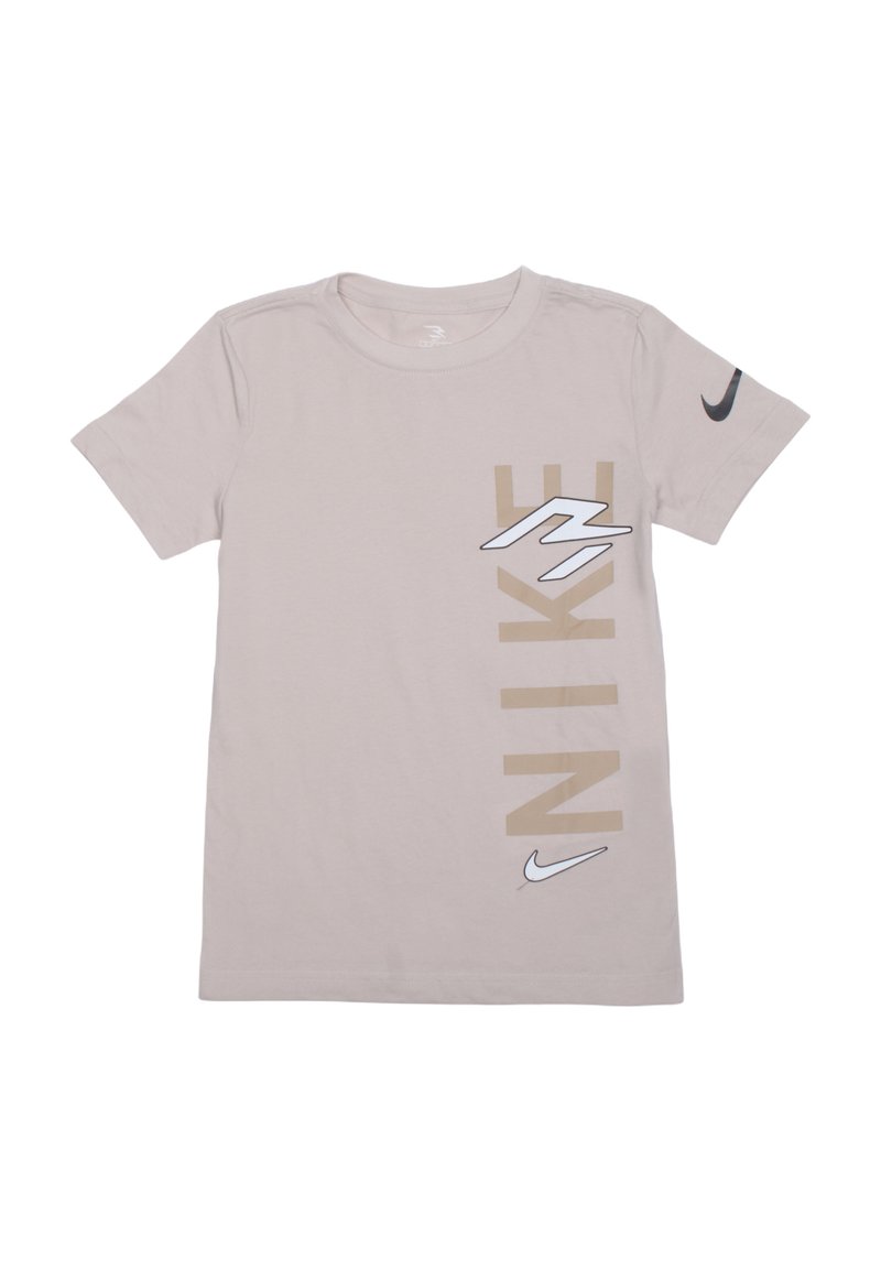 T-shirt beige à manches courtes de Nike avec un grand texte vertical "NIKE" et des logos swoosh sur la poitrine et la manche.