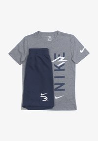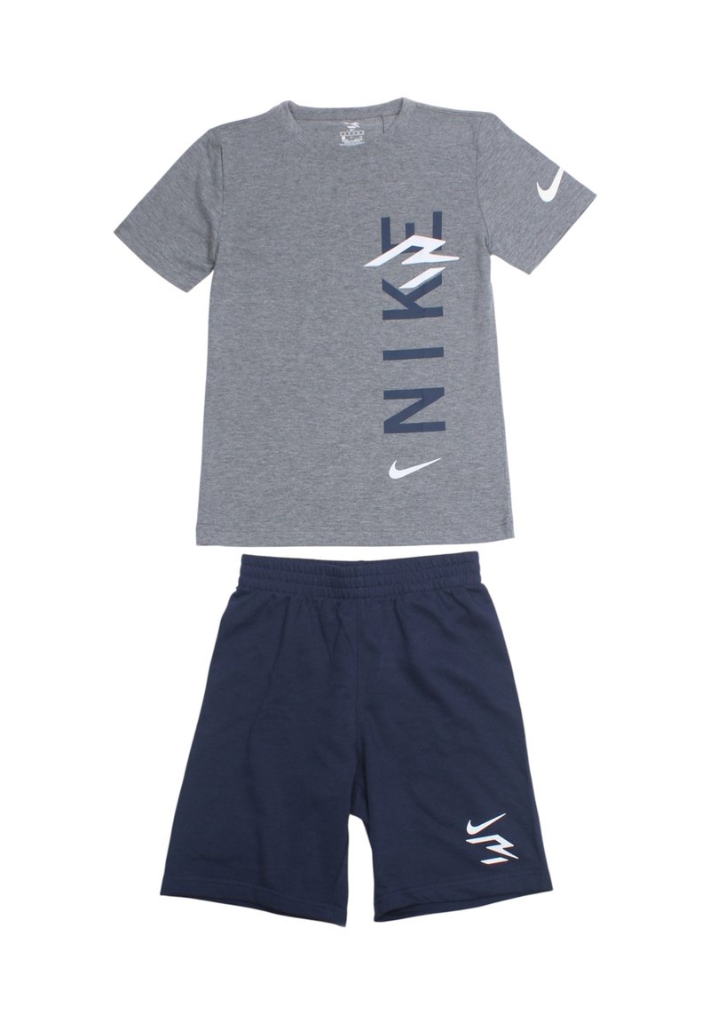 T-shirt en coton gris avec impression verticale "NIKE" en bleu marine et logo blanc ; assorti à un short bleu marine, taille élastique et détail logo blanc.