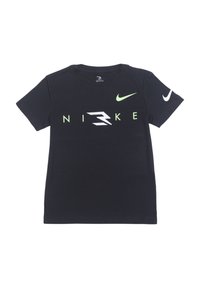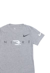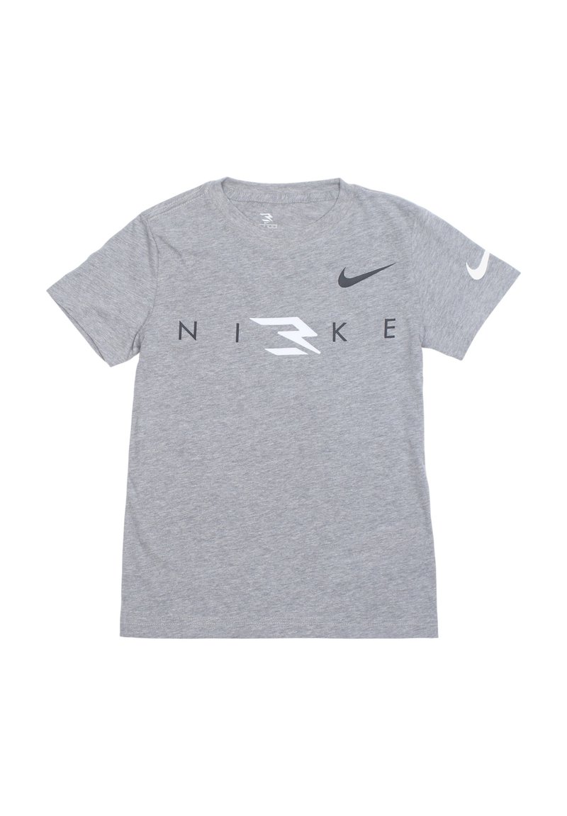 T-shirt en coton gris avec un col rond, des manches courtes et un logo Nike noir et blanc audacieux sur le devant.