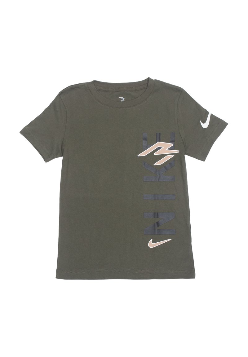 T-shirt Nike manches courtes vert olive avec texte "NIKE" noir vertical, logos Swoosh beige sur la poitrine et la manche gauche.