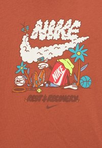 T-shirt à manches courtes de couleur rouille en coton, avec un motif graphique comprenant le texte "Nike", des fleurs et des éléments d'équipement sportif.