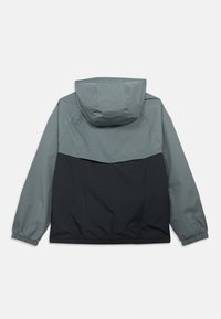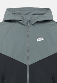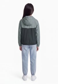 Fille souriante, debout avec les bras légèrement écartés, portant une veste Nike bicolore verte, un jean bleu clair et des baskets blanches sur fond blanc.