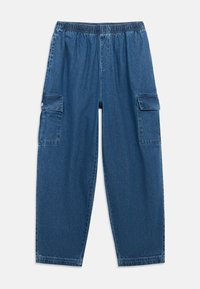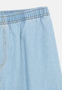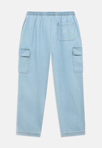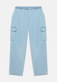 Pantalon cargo en denim bleu clair avec une taille élastique, deux poches latérales et une coupe décontractée. Détails de couture et jambe droite.