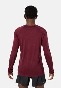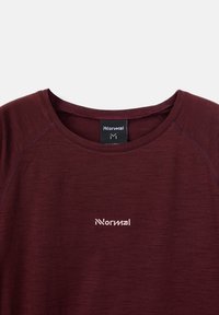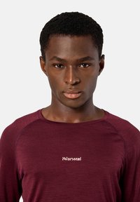 Jeune homme portant un t-shirt de sport à manches longues bordeaux avec le logo "Norwal" et un short noir, debout contre un fond clair uni.
