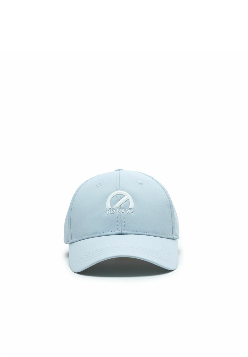 Casquette de baseball bleu clair avec logo brodé représentant un cercle barré d'une ligne diagonale et le texte "NO NAME" sur le devant.