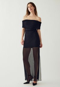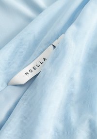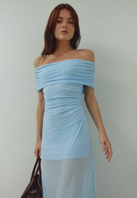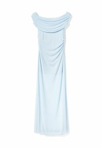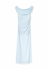 Robe bleu clair froncée, épaules dénudées, en tissu doux. Caractérisée par une silhouette ajustée et une texture lisse, mettant en valeur le décolleté et les épaules.