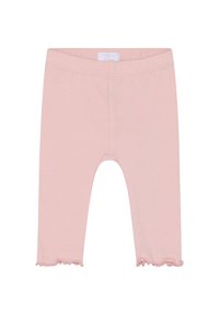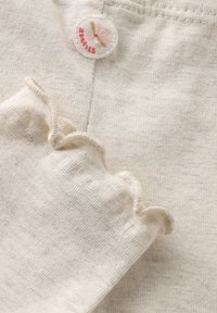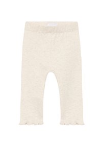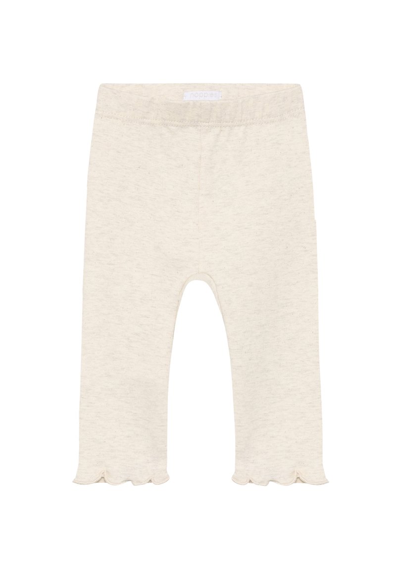 Leggings couleur crème en tissu doux, avec un ourlet festonné, une ceinture élastique, et une apparence simple et sans coutures.