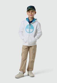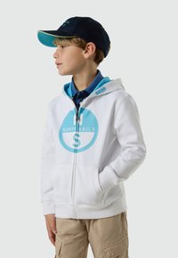 Garçon blond souriant, portant un sweat à capuche blanc zippé avec le logo bleu North Sails et un pantalon beige, debout devant un fond clair uni.