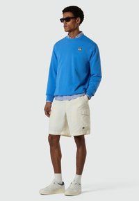 Homme portant un sweat-shirt bleu avec un motif de voilier blanc et le texte "NORTH SAILS" dans le dos, associé à un short cargo beige.