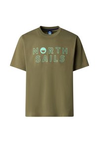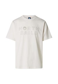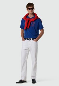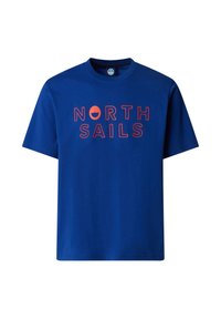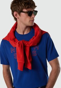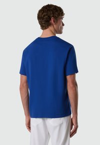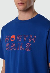 Jeune homme aux cheveux courts et bouclés portant un t-shirt bleu avec le texte rouge "NORTH SAILS" et un pantalon blanc, debout devant un fond gris clair.