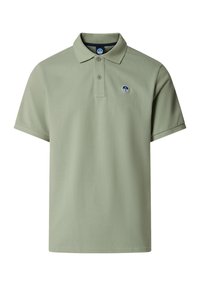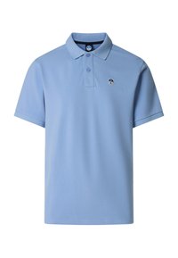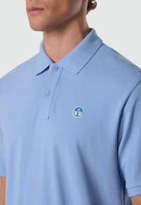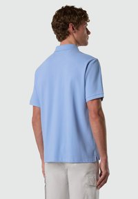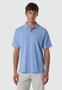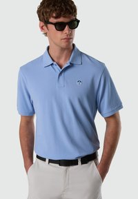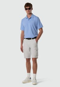 Homme aux cheveux légèrement bouclés, portant un polo bleu clair et un pantalon beige, debout devant un fond uni gris clair.