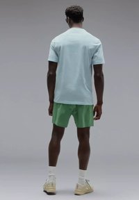 Homme portant des lunettes de soleil noires, un t-shirt Oakley bleu clair, un short vert, des chaussettes blanches et des baskets beiges, debout devant un fond gris.