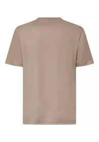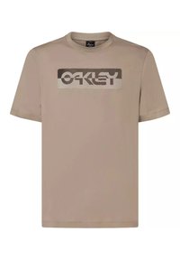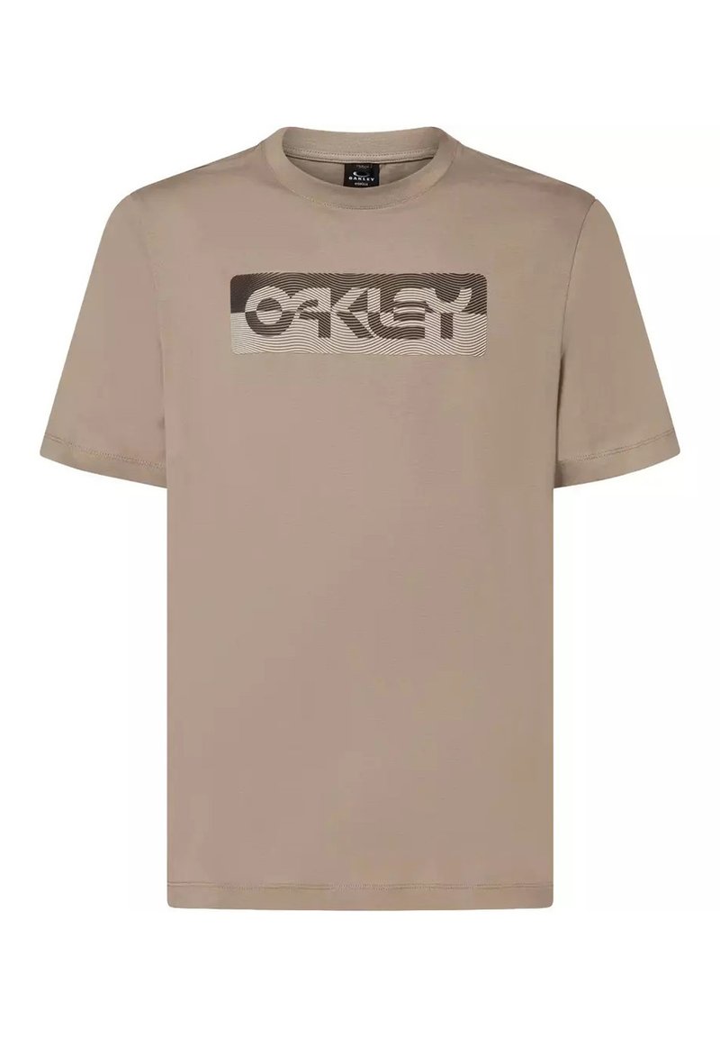 T-shirt beige à manches courtes Oakley avec un logo rectangulaire comportant des lignes ondulées et le nom de la marque sur la poitrine.
