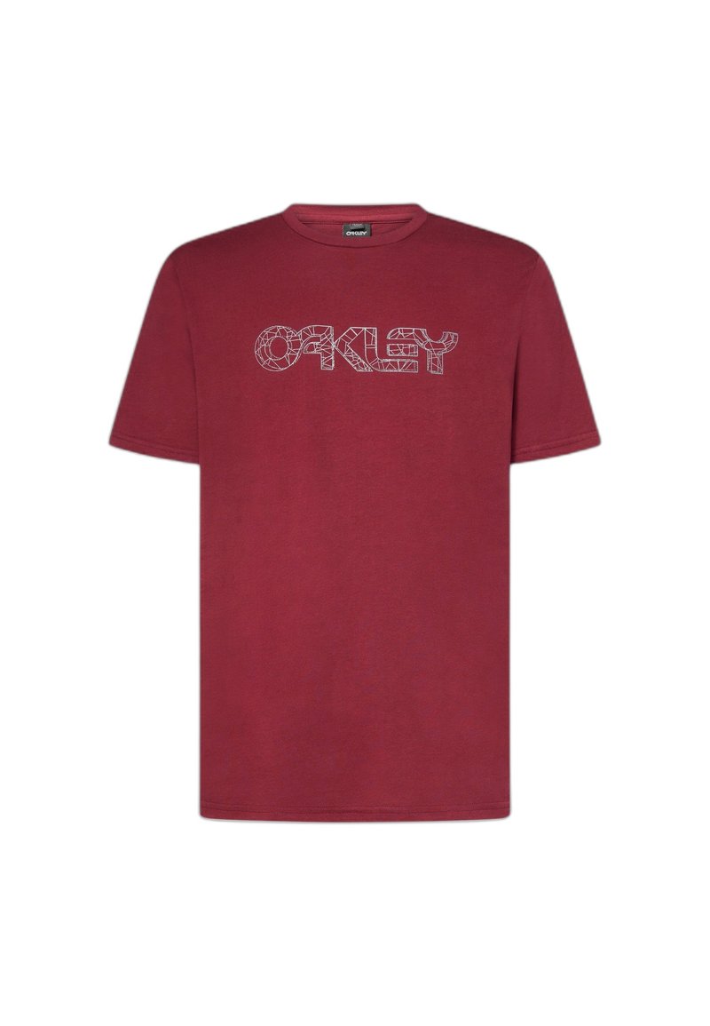T-shirt bordeaux à manches courtes avec un logo "OAKLEY" en contour géométrique centré sur la poitrine.