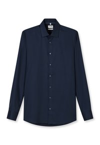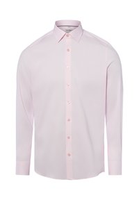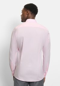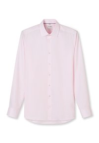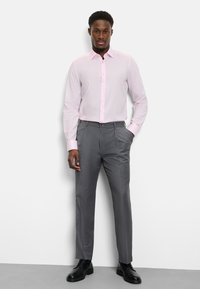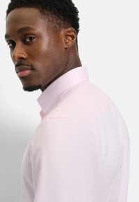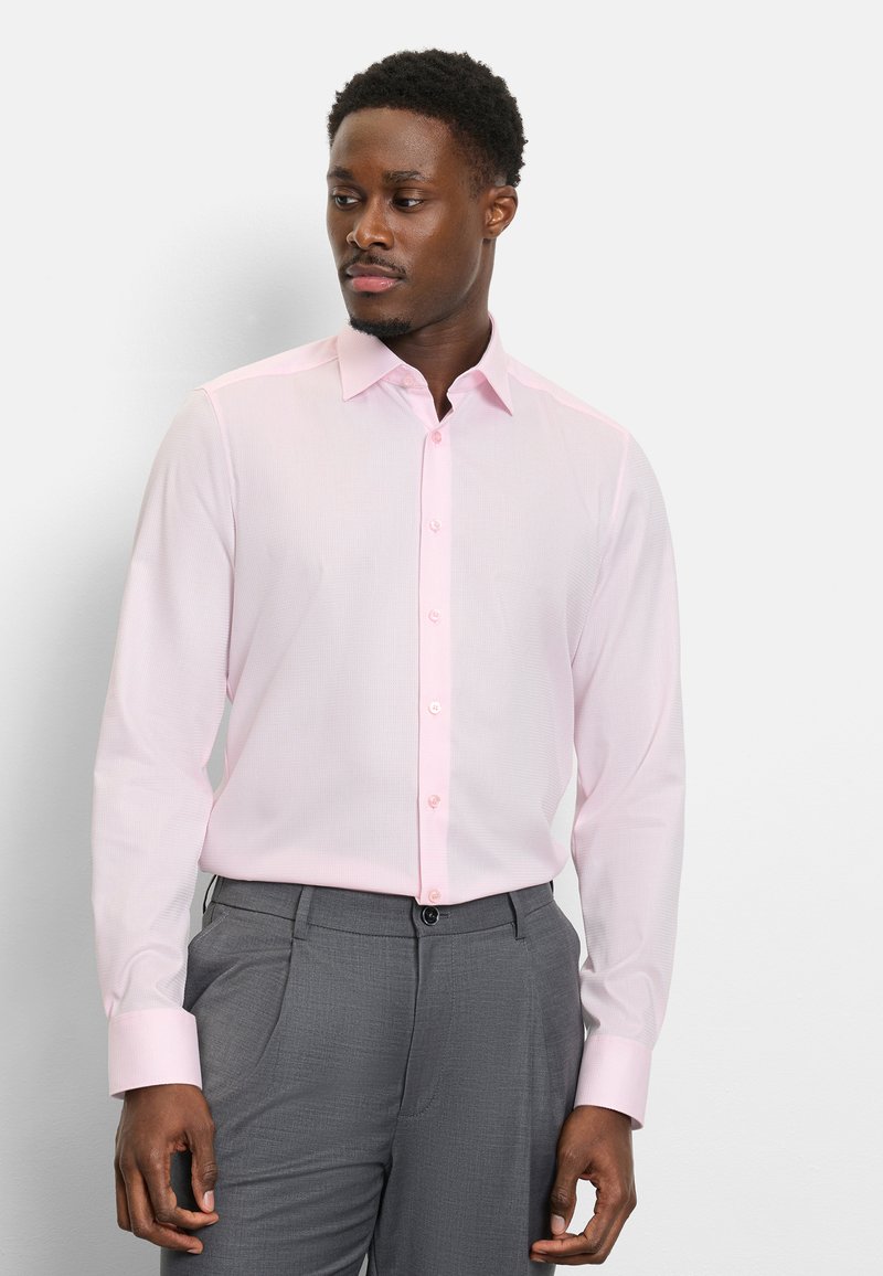 Homme en chemise rose clair à boutons et pantalon gris, debout devant un fond blanc, regardant vers sa gauche.