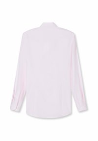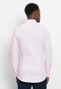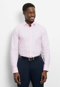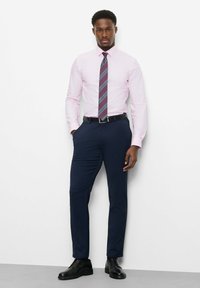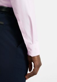 Homme souriant, portant une chemise à manches longues rose clair avec des boutons, rentrée dans un pantalon bleu marine foncé avec une ceinture noire, debout contre un mur blanc.