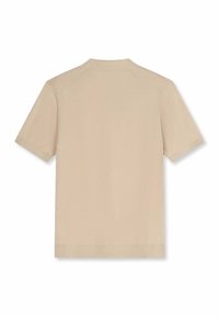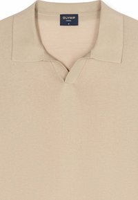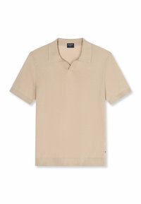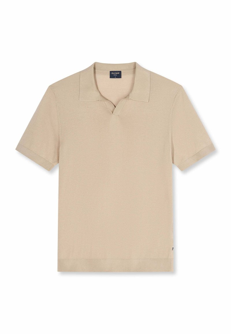 Polo beige à manches courtes avec un col plat et une petite encoche en forme de V au niveau de l'encolure, présenté sur fond blanc.