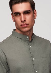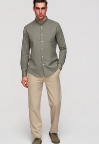 Homme portant une chemise kaki à manches longues avec un col mandarin et un pantalon beige, debout avec une main dans la poche.