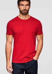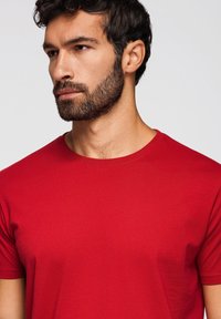 Homme barbu portant un t-shirt rouge uni à manches courtes et un jean sombre, debout avec une main dans la poche sur un fond clair.