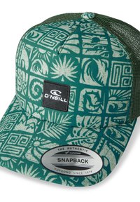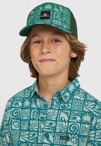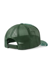 Casquette de camionneur verte avec un devant à motifs comprenant des feuilles et des designs géométriques ; chemise assortie couleur sarcelle avec des motifs similaires et un col boutonné.