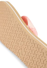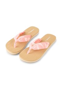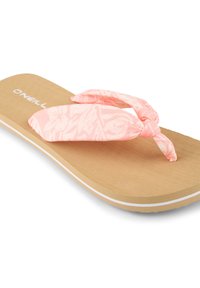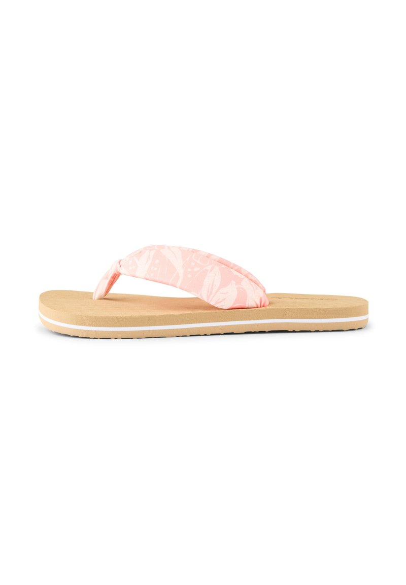 Tongs roses à motif floral avec une bride en tissu rembourré et une semelle en caoutchouc beige, ornée d'une ligne d'accent blanche. Design plat.