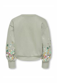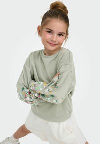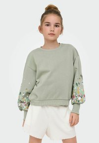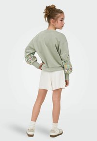 Jeune fille debout, jambes écartées, portant un sweat-shirt vert clair à manches fleuries et un short blanc, sur un fond uni.