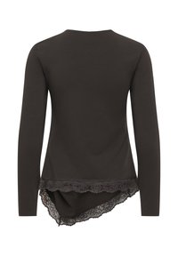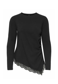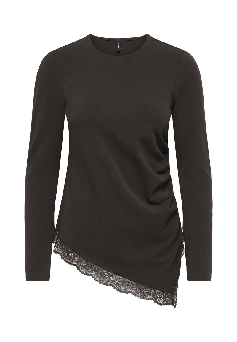 Haut noir à manches longues pour femme avec ourlet asymétrique et bordure en dentelle sur le côté inférieur droit, présentant un léger froncé latéral.