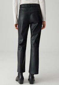 Pantalon en cuir noir à jambe droite avec une texture lisse, doté d'une fermeture éclair à l'avant et de coutures latérales contrastées pour un détail supplémentaire.