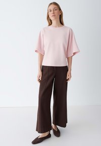 Femme aux cheveux raides portant un haut ample à manches courtes rose clair et un pantalon marron foncé, debout avec une main dans la poche sur fond blanc.