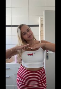 • Débardeur blanc à rayures avec le texte "HOT AND SPICY" et un graphique de piment, associé à une mini-jupe rayée rouge et blanche. Sac tressé et accents de bijoux.