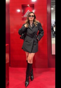 • Robe blazer noire à silhouette ajustée, associée à des bottes à talons noires montant jusqu'au genou. En arrière-plan, un mur rouge avec des étagères et des miroirs.