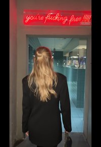 • Blazer noir oversize à un bouton, porté sur une mini-jupe. En arrière-plan, des murs carrelés turquoise. Accessoire : sac à bandoulière en chaîne.