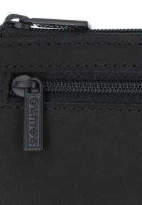 Petite pochette noire zippée avec poche zippée à l'avant et motif bleu dans le coin inférieur droit.