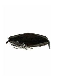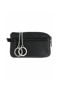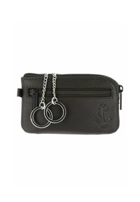Petite pochette en cuir noir avec fermeture éclair sur le devant, deux anneaux de clés argentés sur chaînes, et symbole d’ancre en relief dans le coin inférieur droit.