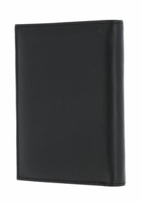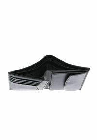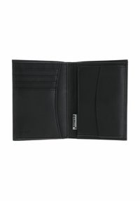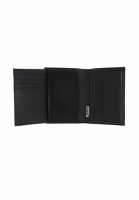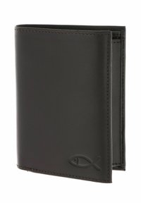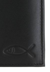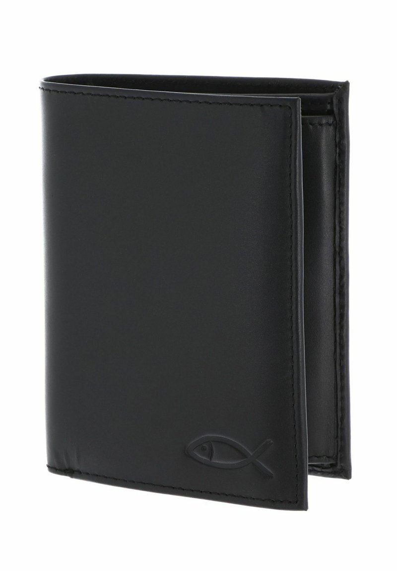 Portefeuille bifold en cuir noir avec symbole de poisson embossé en bas à droite, présenté légèrement ouvert sur fond blanc.