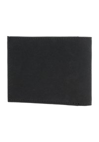 Portefeuille noir bifold avec un petit symbole de poisson argenté embossé dans le coin inférieur droit du panneau avant.