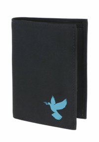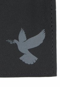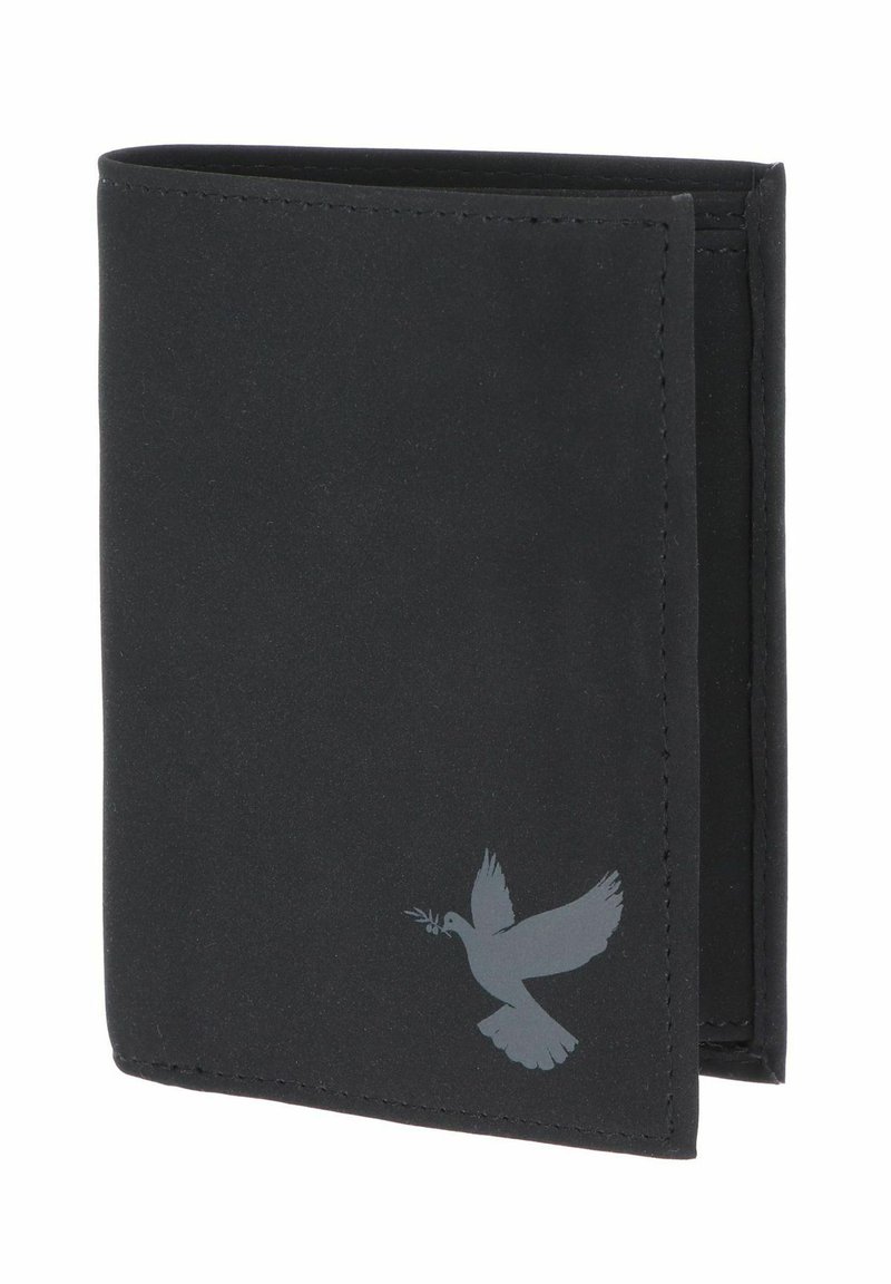 Portefeuille noir plié avec une colombe grise portant une branche d'olivier imprimée dans le coin inférieur droit.