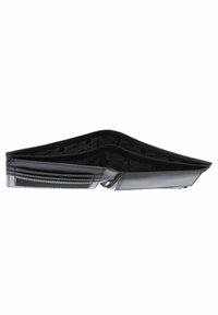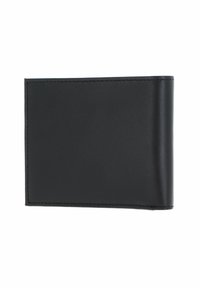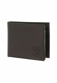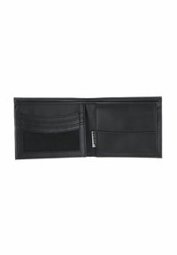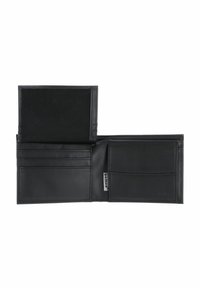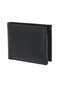 Portefeuille bifold en cuir noir avec un motif floral embossé subtil à l'avant, légèrement ouvert montrant les compartiments intérieurs.