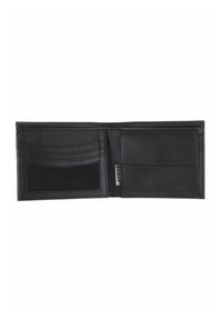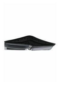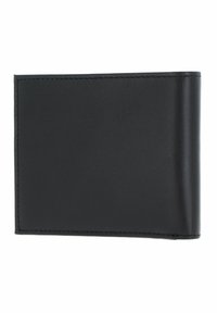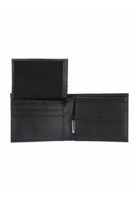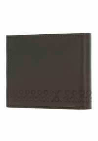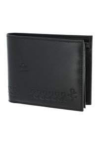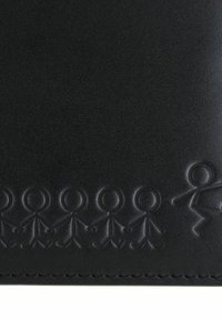 Portefeuille noir en cuir bi-pli avec motif en relief de chaîne de bonshommes bâton le long du bord inférieur et une figure au-dessus de la chaîne.