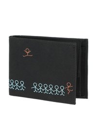 Portefeuille noir bifold avec plusieurs petites figures en bâton imprimées le long du bas et deux en orange sur les bords supérieur gauche et droit.