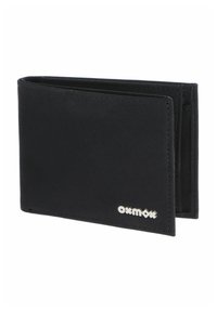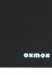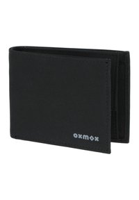 Portefeuille bifold noir avec bords cousus et petit logo "oxmox" bleu clair dans le coin inférieur droit.