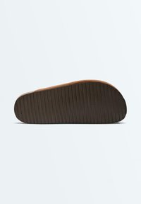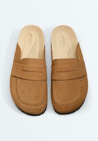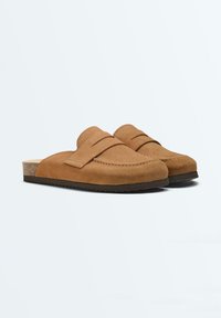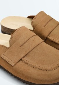 Mule à enfiler en daim marron clair avec une semelle en liège et une semelle extérieure en caoutchouc plate et rainurée, présentant une bride cousue sur le dessus.