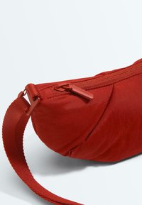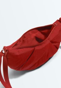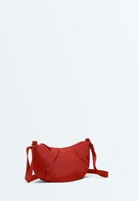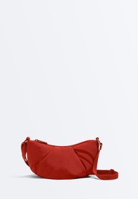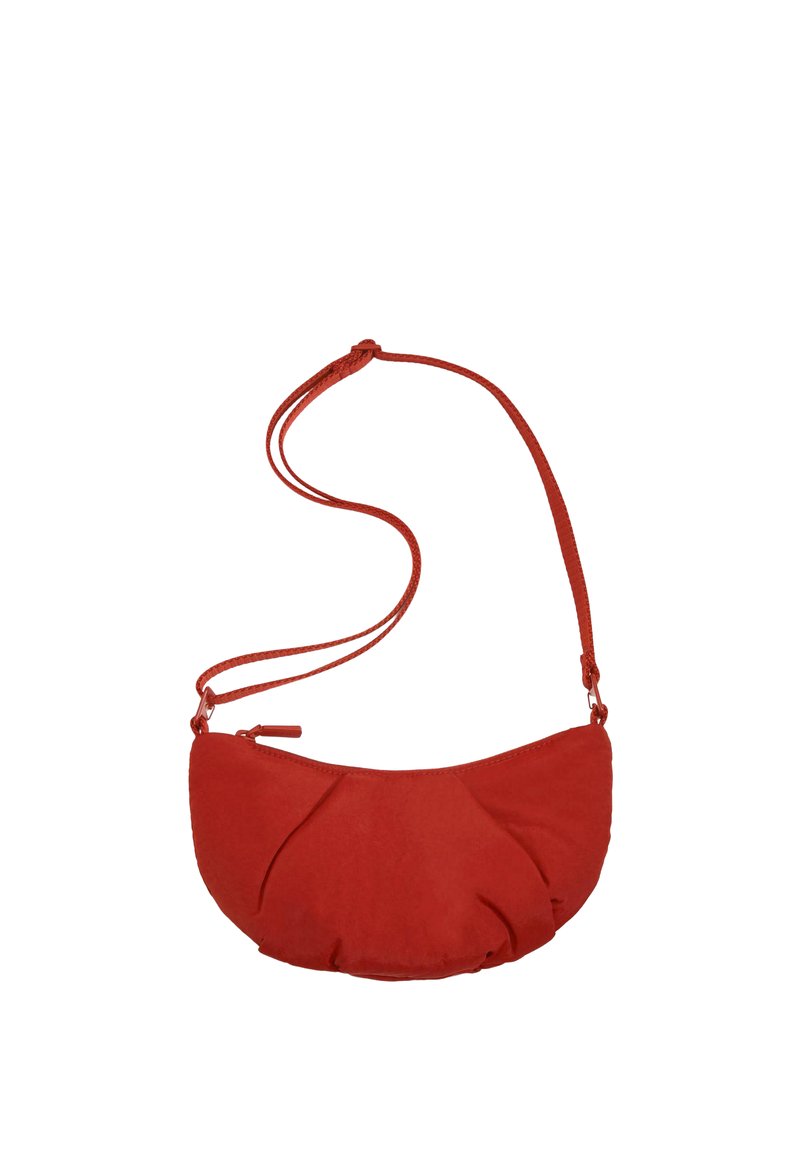 Petit sac d'épaule rouge en forme de croissant avec une longue bandoulière réglable et une fermeture éclair.