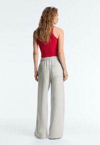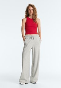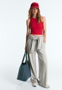 Femme aux cheveux blonds ondulés portant un crop top rouge sans manches et un pantalon de survêtement gris clair à cordon, debout devant un fond uni.