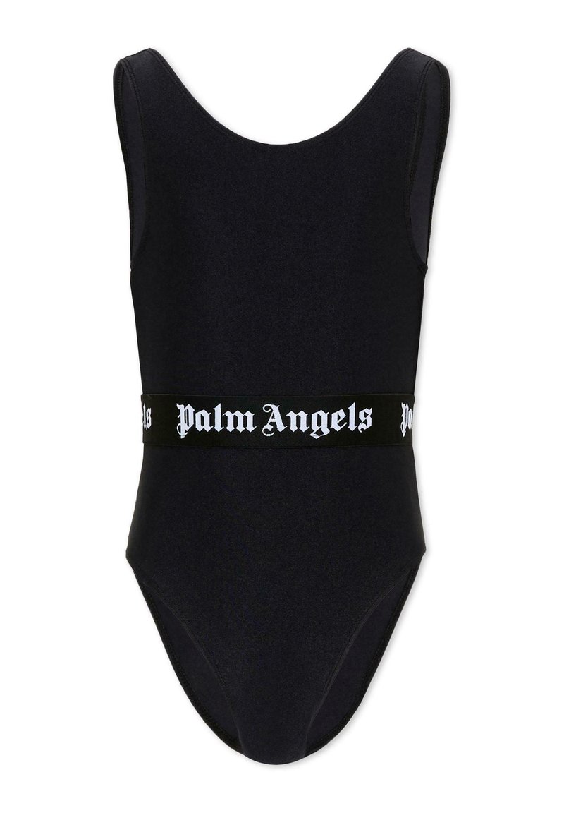 Maillot de bain noir sans manches avec larges bretelles et une ceinture noire ornée du texte gothique blanc « Palm Angels ».
