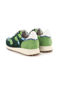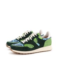 Paire de baskets basses en daim vert, avec des motifs géométriques bleus, des lacets blancs et des semelles beiges, vues de profil sur un fond blanc.