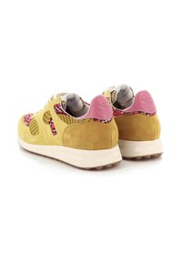 Baskets en daim jaune, tissu à motifs roses et marron, lacets blancs, languette de talon rose, et semelle beige, vues de profil.
