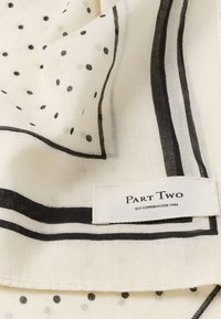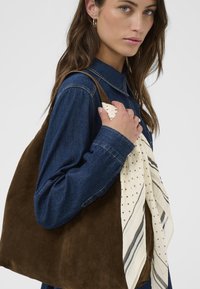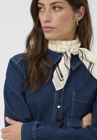 Femme portant une robe en denim bleu foncé avec poche avant, fermeture à boutons, manches longues, et un foulard blanc à motifs autour du cou.